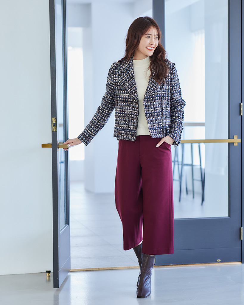 トップスも合わせやすく、カジュアルにもエレガントにも着こなせます。
