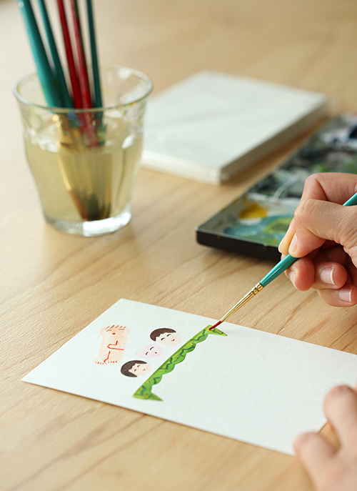 絶妙なバランスの文字を、下描きなしで描いているというから驚き。色をのせるごとに頭のなかで次のイメ