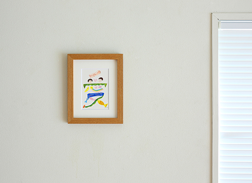 木工作家の友人による手作りの木製額に入れることで、作品にほどよい空間が生まれ、より存在感が際立ちます。天然木のオーク材を使った額は、ほっこりしすぎない落ち着いた佇まいで、どんなテイストのお部屋