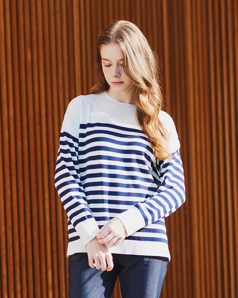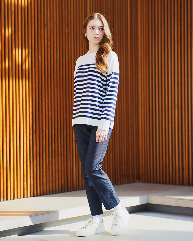 シックな配色のパネルボーダーが上品見えするボーダーニットプルオーバー。