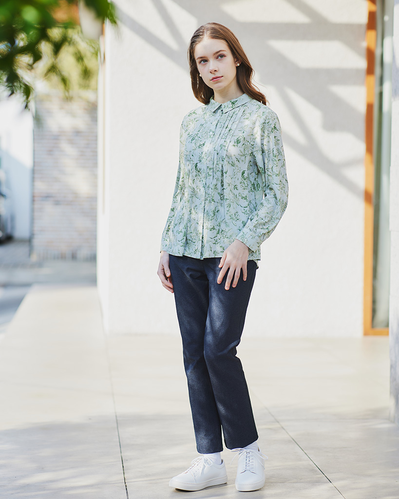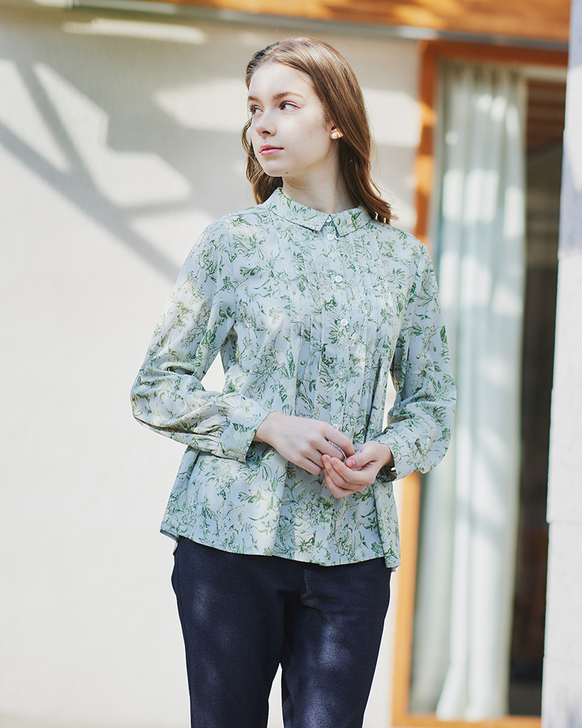 上品なボタニカル柄をプリントした滑らかな肌触りのシャツカラーブラウス。