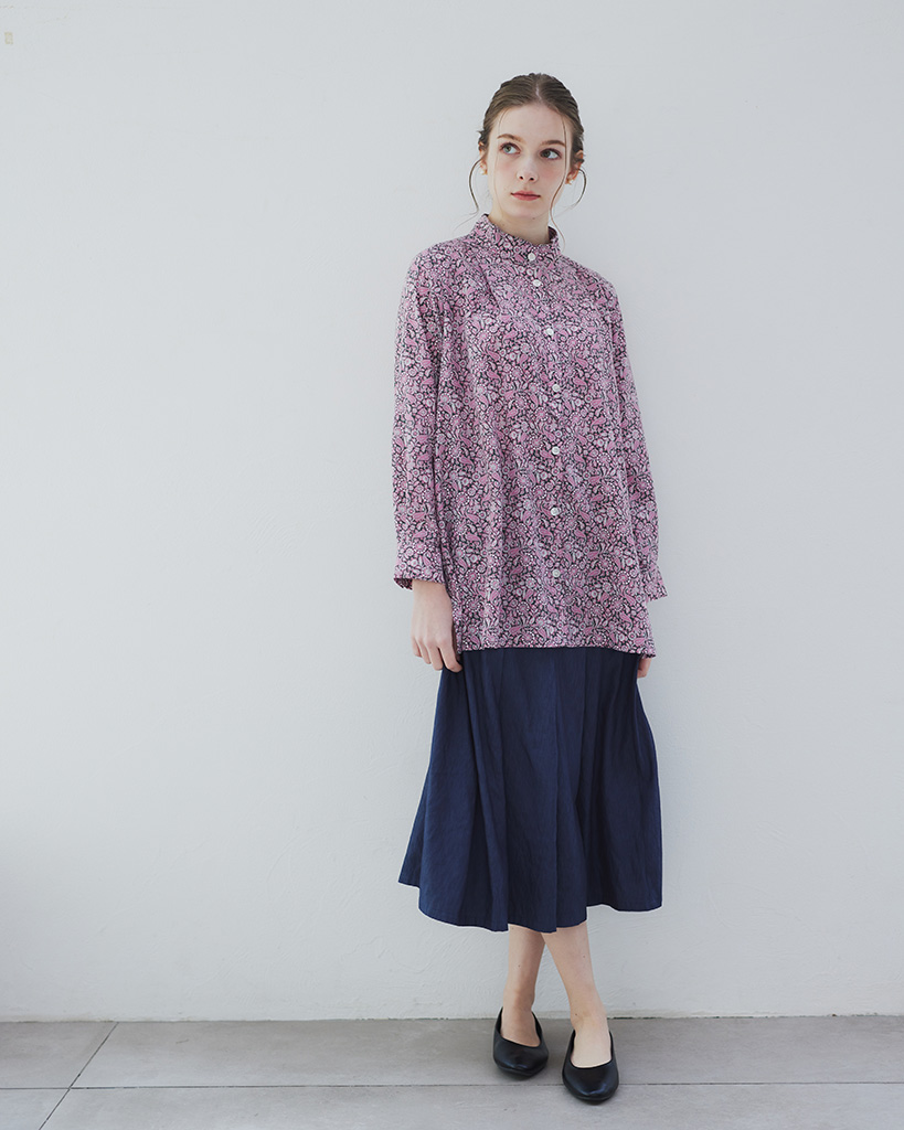 顔周りがすっきり見えするスタンドカラーのチュニック丈で洗練されたスタイリッシュな着こなしに。