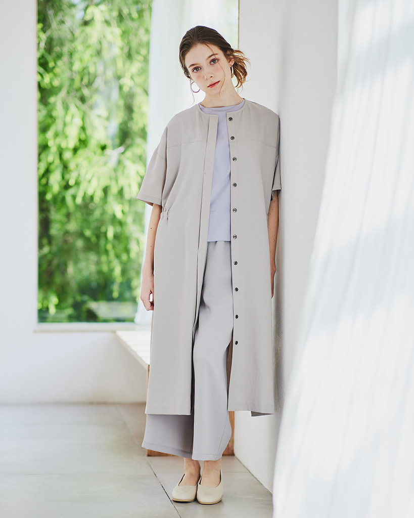 さらっとした肌触りでナチュラルなシワ感のあるポリエステル素材を使用し、リラックス見えしながらきちんと感のあるルックスです。