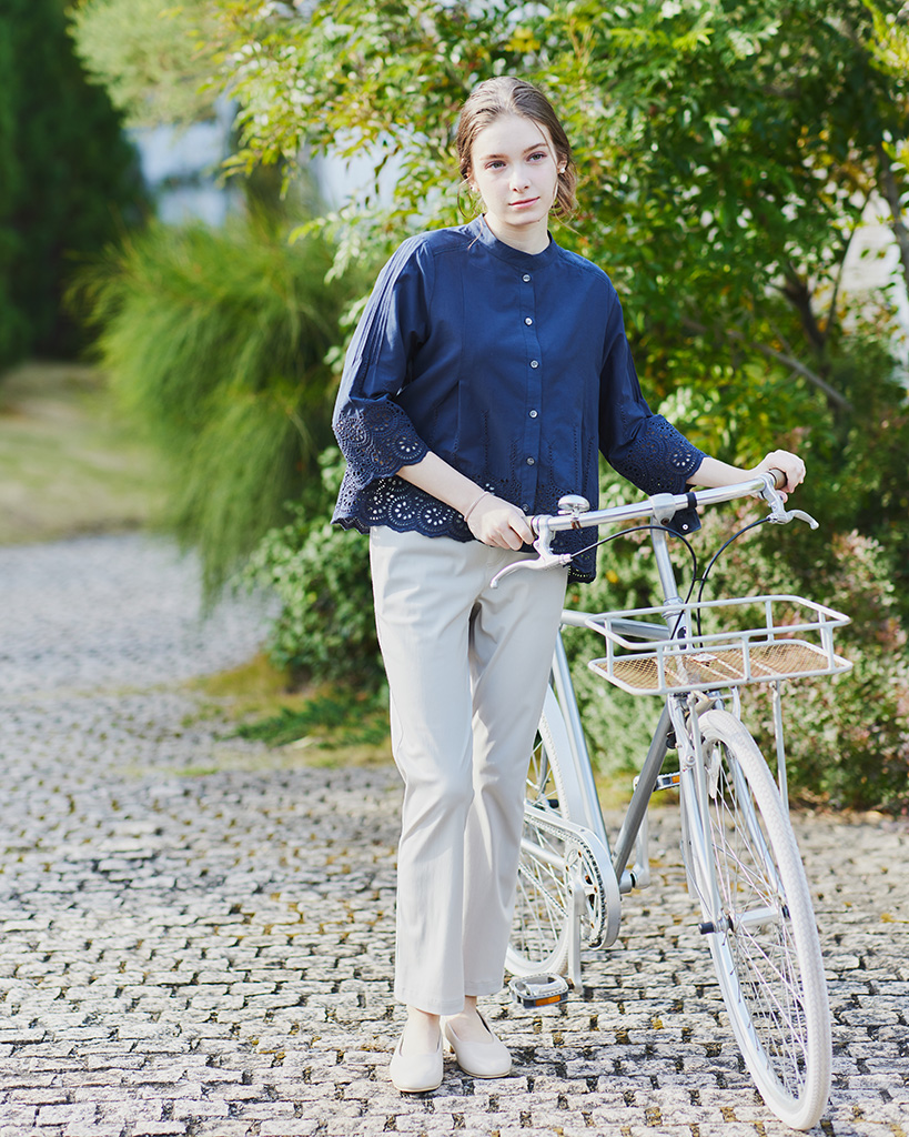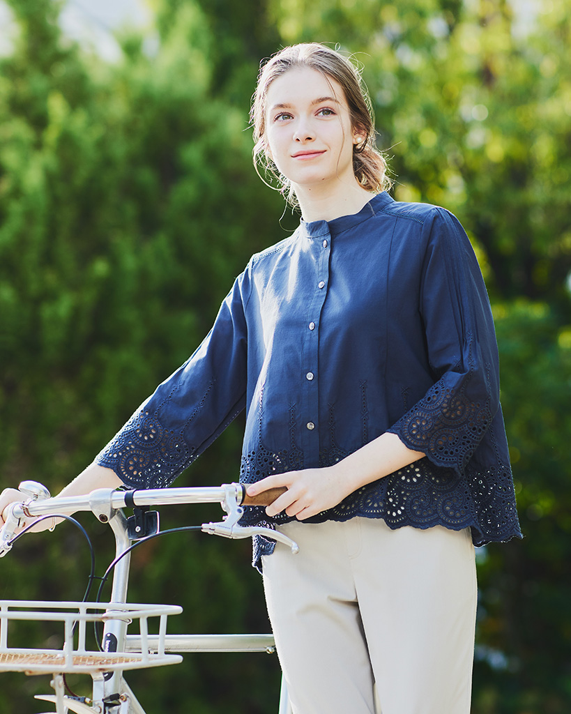 刺繍ブラウス ¥19,800 裾と袖口にクラフト感のあるカットワーク刺繡がエレガントなスタンドカラー刺繡ブラウス。 なめらかな肌触りで程よい光沢のある綿セルロース素材を使用しています。 ■Shop List