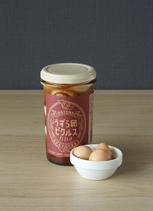 意外に思える卵のピクルスですが、イギリスでは「ピクルドエッグ」といってスーパーでも買えるメジャーな食べ物なのだそう。ハテナソースのうずら卵ピクルスは、甜菜糖を使った甘めの漬け液にカカオを加えることで酸味がまろやかに。一見するとチョコレートのように見えますが、お菓子のような甘味はなく、ほのかにカカオの風味が広がります。