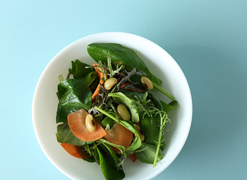 人参のピクルスと青豆のピクルスをサッと和えたベビーリーフのサラダ。まろやかな酸味と鮮やかな彩りが食欲をそそります。