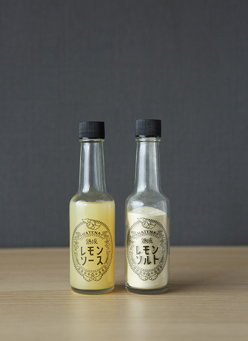 レモンソースは、熟成させることで旨みを引き出した塩気のある味わい。ジン(洋酒)の香りづけに使われるジュニパーベリーがさわやかに香ります。レモンソルトは、塩で熟成させたレモンの皮を粉末にしたも の。どちらも料理のジャンルを問わず、何にでも使える万能調味料です。