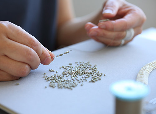 直径1~2 ㎜の小さなガラスビーズを糸でつなぎ、大人もこころ踊るビーズアクセサリーを目指し制作。昨年からワークショップを開始。今後はさらにビーズワークの楽しさを共有する機会も増やしていく予定。