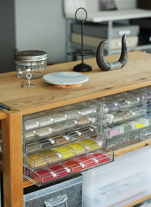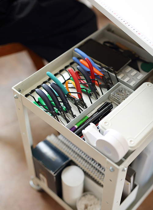 制作する傍らにあるワゴンには、きちんと整理された工具や資料が。お子さんが生まれるまでは、ビーズ以外のモノづくりもしていたそうですが、小さいお子さんにとって危険な作業や工具が多かったため、徐々にビーズワークに絞っていき、今の作風が確立されていったのだそうです。