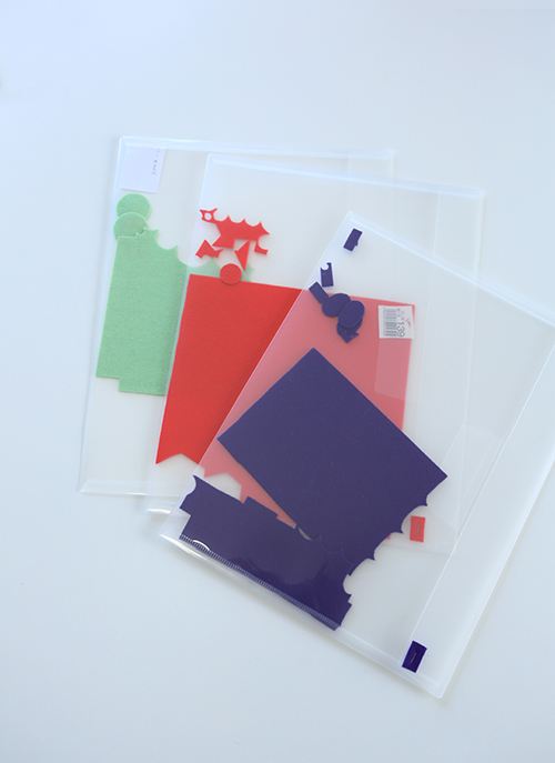 立体的なモチーフに詰めるフェルトシート。ファイリングすることで、偶然できた切れ端が何かの形に見えてくるから不思議。