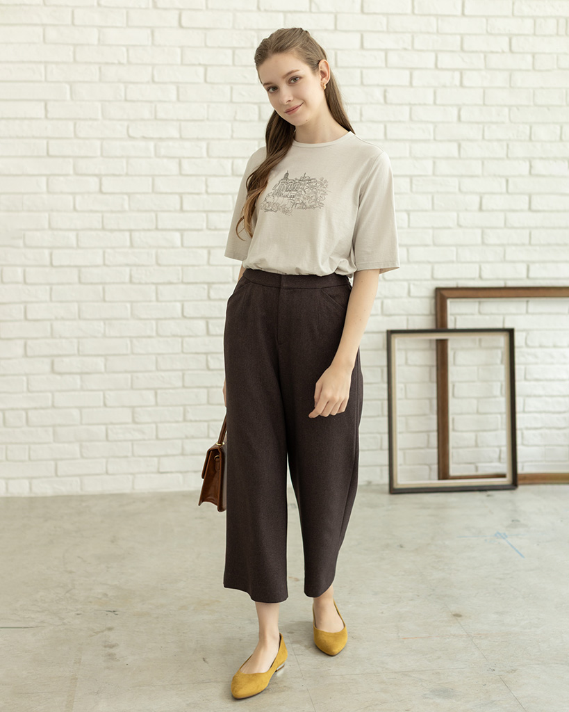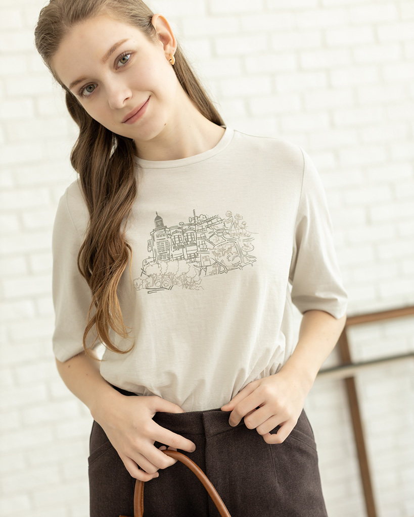 暑い季節でも快適に過ごせる強撚綿天竺カットソー。 同系色のタウン&カフェモチーフプリントをアクセントにしています。 気になるヒップ周りをカバーするやや長めの着丈です。 ■Shop List