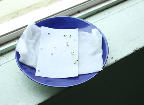 ①春か秋にシードペーパーをひと晩水に浸し、タネに水分を含ませる。
