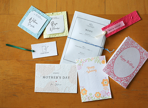 環境に配慮した商品を使うことは企業のイメージアップにつながるため、名刺、商品タグ、ノベルティーなど、企業から依頼を受けることが多いそうですが、小ロットでも注文できるので、ショップカード、レストランのメニュー、結婚式のカードなど、個人的なオーダーやスタートアップの印刷物としても魅力的です。