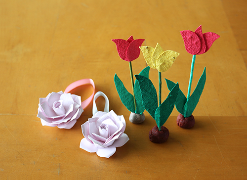 小学校やイベントに出向き、環境とSDGs について学ぶワークショップを開催することも。カットしたシードペーパーを貼り合わせてペーパーフラワーを作ったり、紙漉き体験を行ったりするそうです。