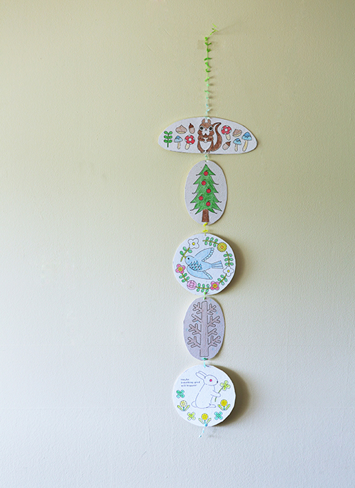 シードペーパーに描かれた絵を色鉛筆で塗り、カットしてヒモをつなげばガーランドやモビールに。塗り絵にはリラクゼーション効果があるといわれているので、子どもといっしょに大人も楽しんでみては。しばらく鑑賞したあと土に埋めれば、春にはカモミールの花が咲きます。