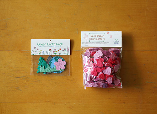 さまざまな形に型抜きされたシードペーパー。左の地球や木がモチーフになったグリーンアースパックは、メッセージを添えてギフトカードに。右のミニハートパックは、結婚式の席表に添えたり、花嫁のブライダルシャワーに使ったりするのがおすすめ。ゲストへのお土産になるので、帰ってからの楽しみが増えそうです。