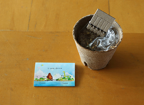 世界で活躍するイラストレーター、はやさきちーこさんが描く華やかなイラストに「Thank You」の文字が添えられたメッセージカード。メッセージを受け取ったら、土に還してジャーマンカモミールの花を咲かせましょう。