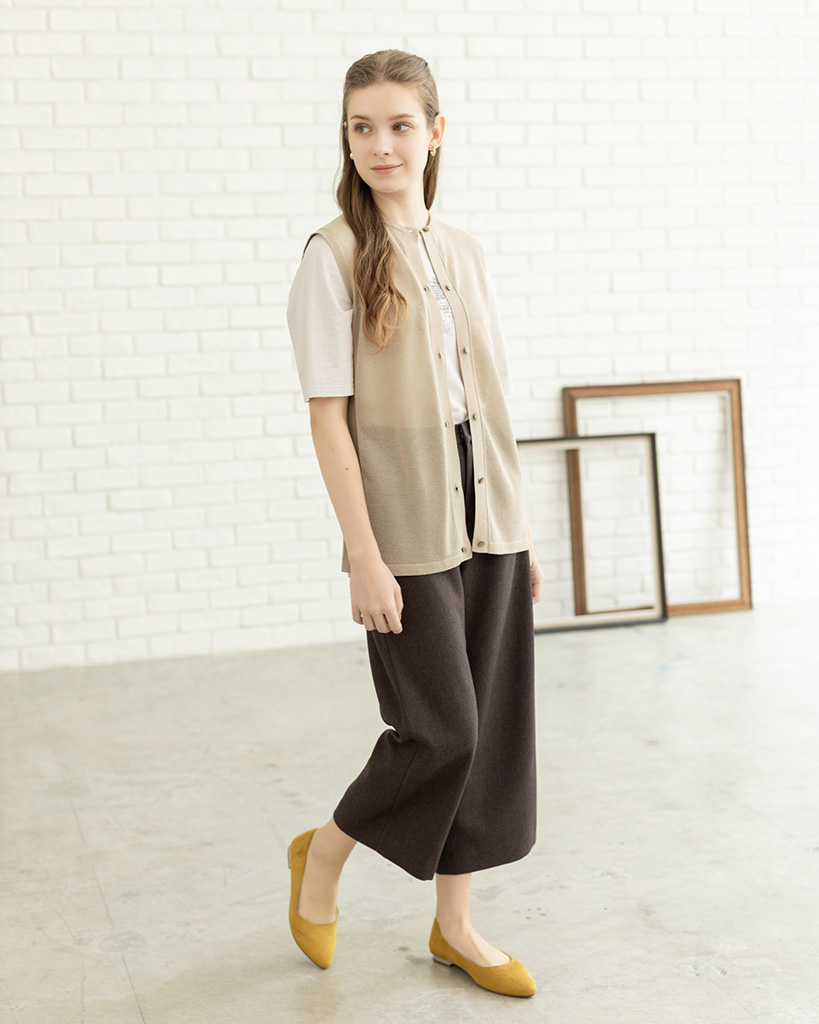 美しい発色で程よい光沢のあるラメと上品なシアー感がエレガントな雰囲気のニットベストです。