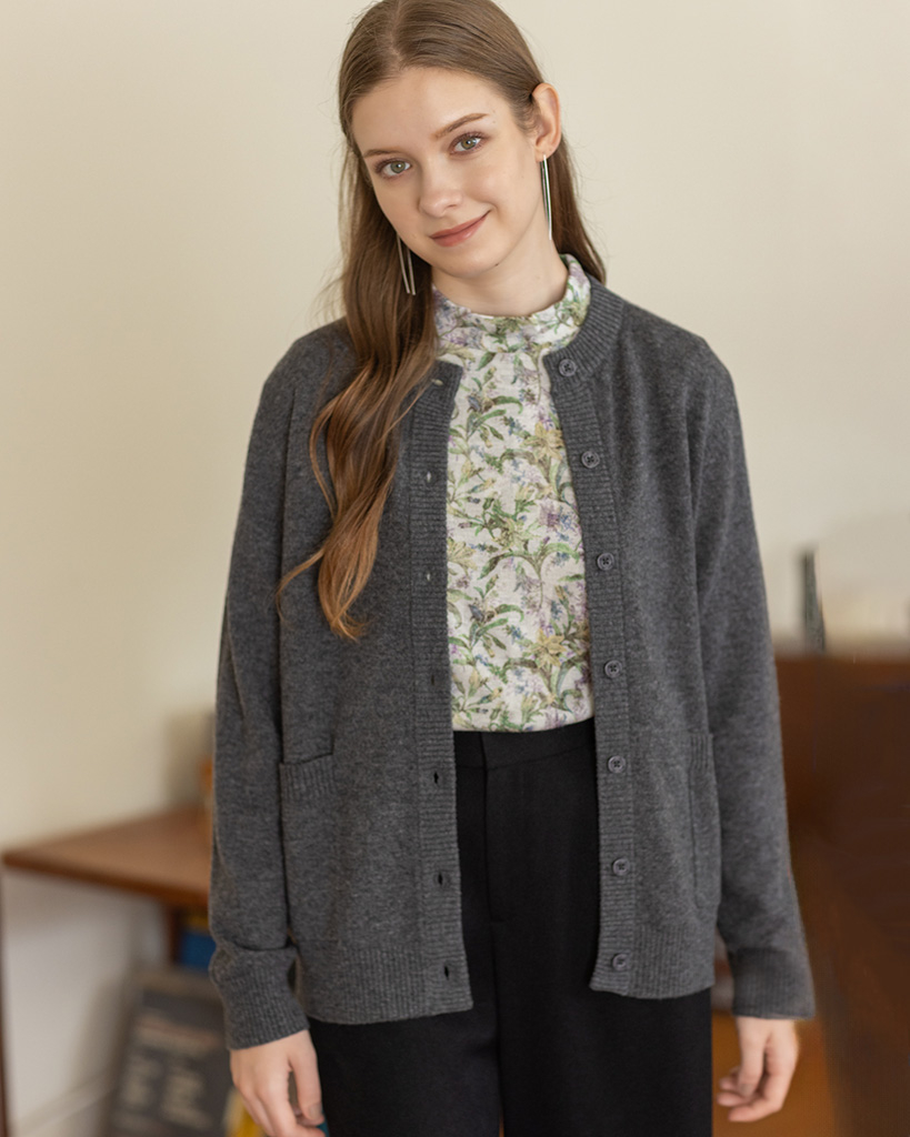 ソフトWOOLニットカーディガン ¥19,800 軽く、ふんわりと柔らかな肌ざわりのカシミヤ混ウールカーディガン。 首周りと前立て、ポケット口のリブ切り替えをデザインアクセントにしています。