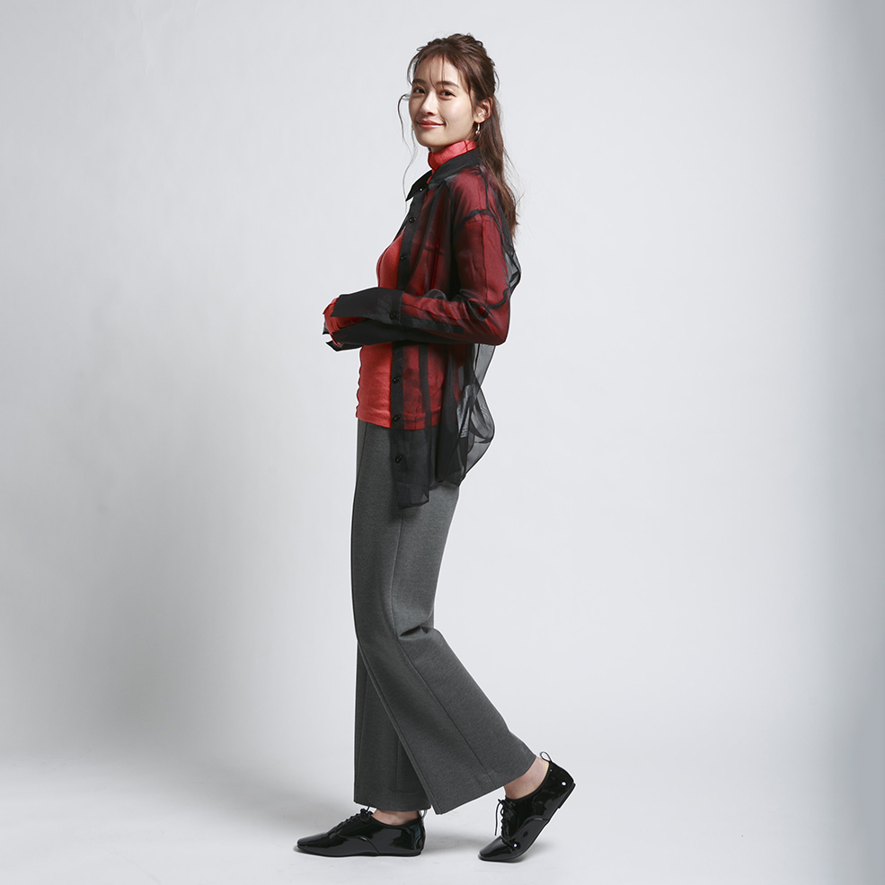 適度な落ち感がありきれいなシルエットのセミワイドパンツです。