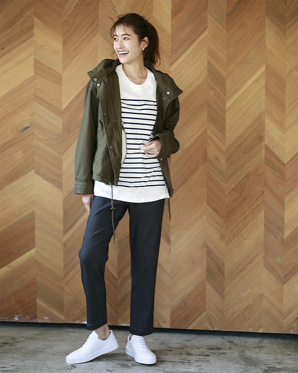 シルエットは、程よいゆとりのストレート。配色ステッチ使い(白のみ同色)と、後ろのアウトポケットでカジュアル感UP.