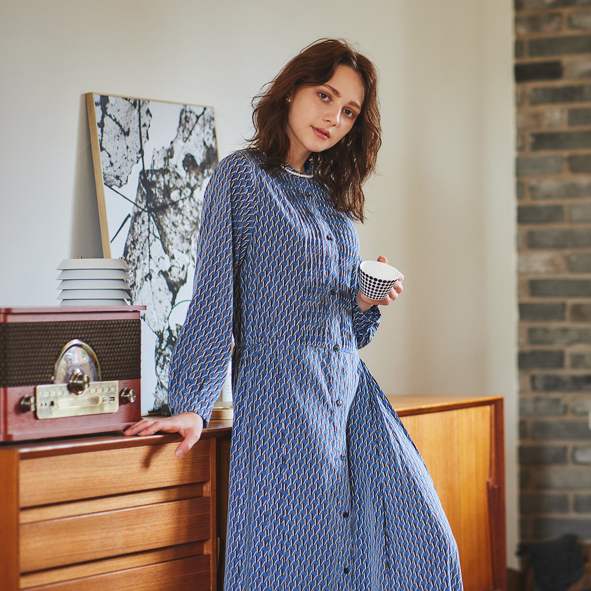 プリーツワンピース ¥26,400 モダンな幾何柄をプリントしたバンドカラーワンピース。 ウエストゴムで適度にシェイプすることで細見え効果のあるスタイルアップア...