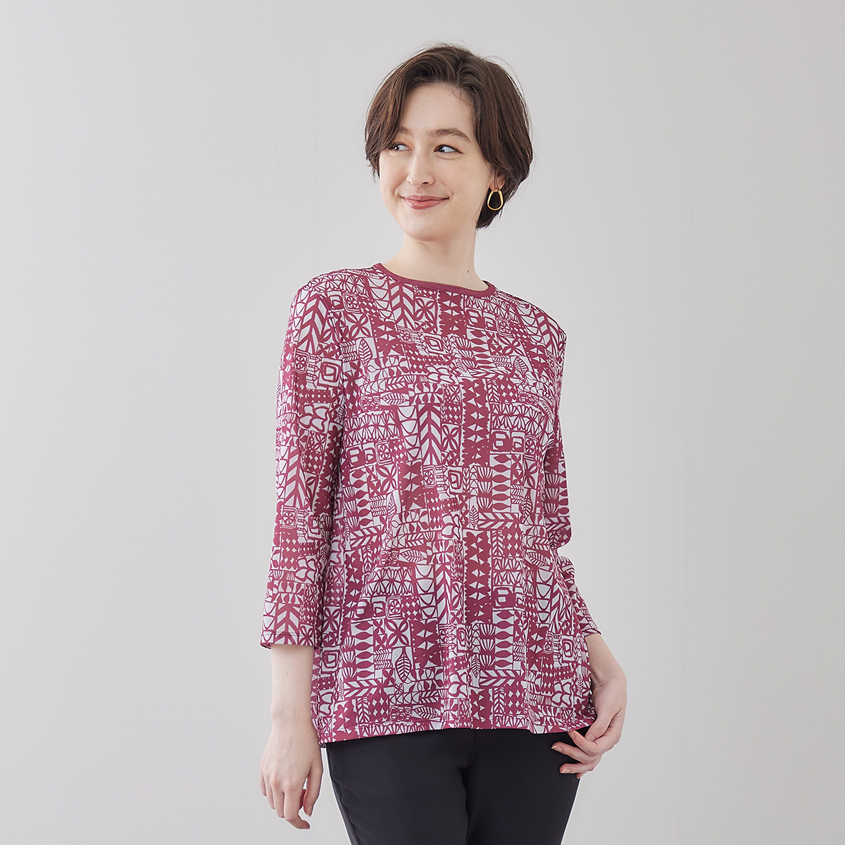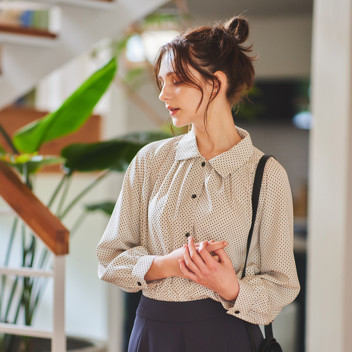 ラグランスリーブブラウス ¥19,800 肩幅が目立たず優しい印象を演出しながらシルエットを綺麗に魅せてくれるラグランスリーブブラウス。 ドット幾何柄の微光沢の...