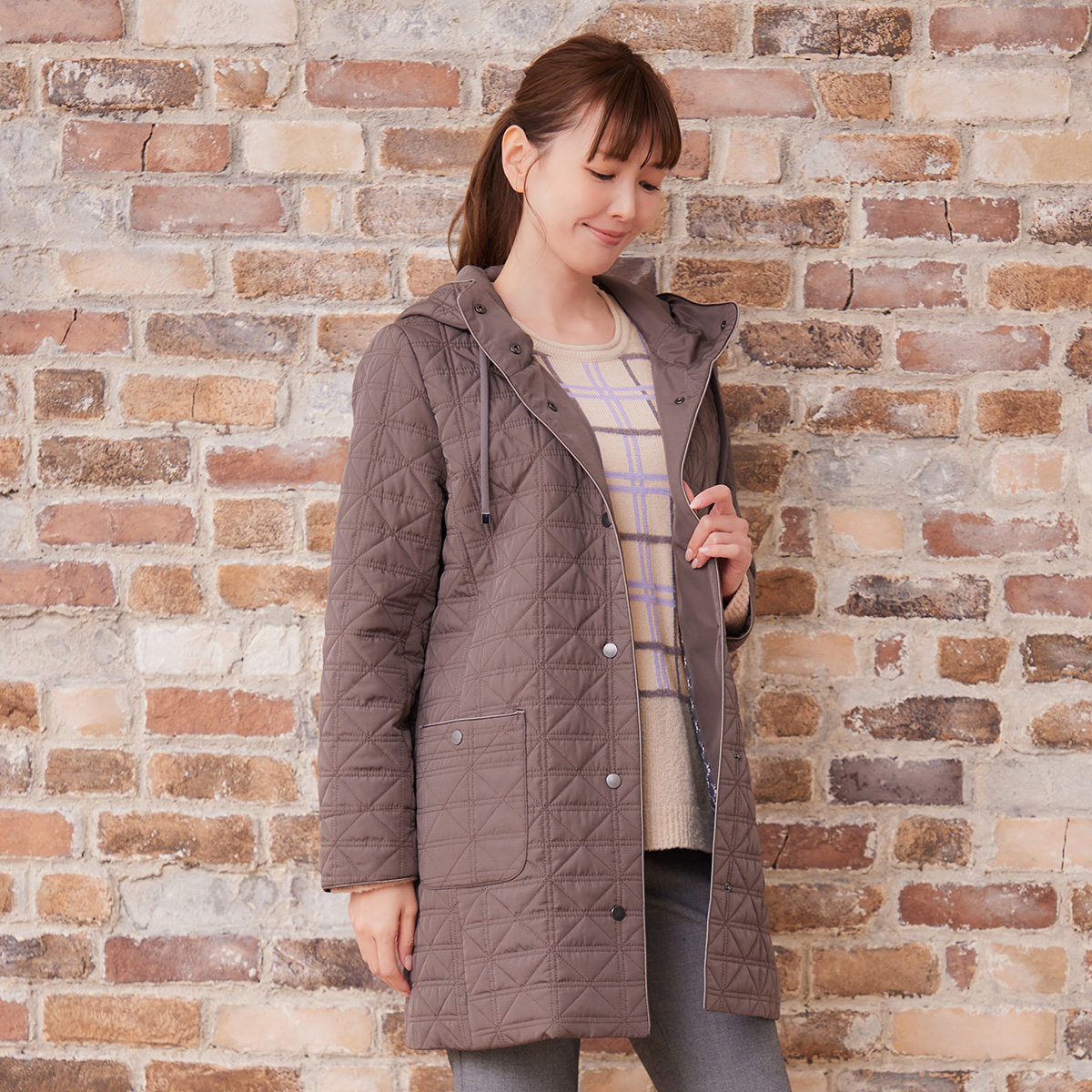中綿キルトコート ¥36,300 秋冬のロングシーズン活躍するフーデット中綿キルトコート。 ダイヤ柄モチーフのキルトステッチに光沢のあるパイピングテープがデザイ...