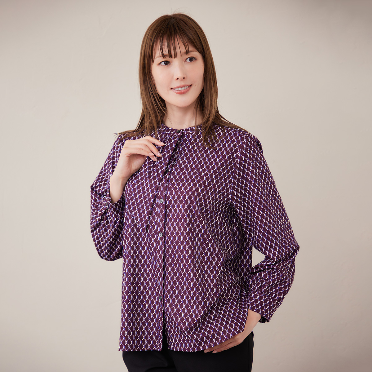 ラッフルタイブラウス ¥17,600 エレガントな印象を与えるラッフルタイブラウス。 美しい光沢のポリエステル素材に上品なジオメトリックプリントできちんと感のあ...