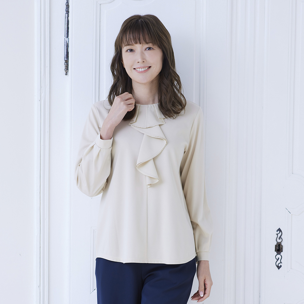 フリルカットソー ¥15,400(税込) 柔らかなタッチの微光沢カットソーに、トレンドのフリルデザインをあしらい、上品なルックスに。 一枚着はもちろん、カーディ...