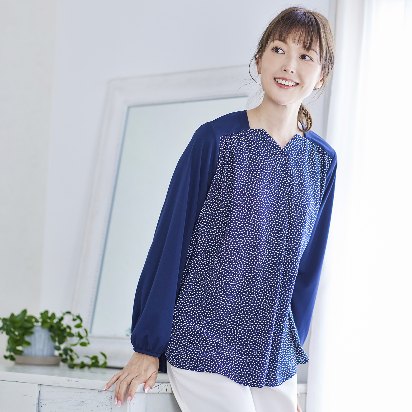 ストレッチドットブラウス ¥17,600(税込) ドットプリントを施した布帛素材を前身頃に、袖・後ろ身頃に快適な着心地のジャージ素材をドッキングしたストレッチブ...