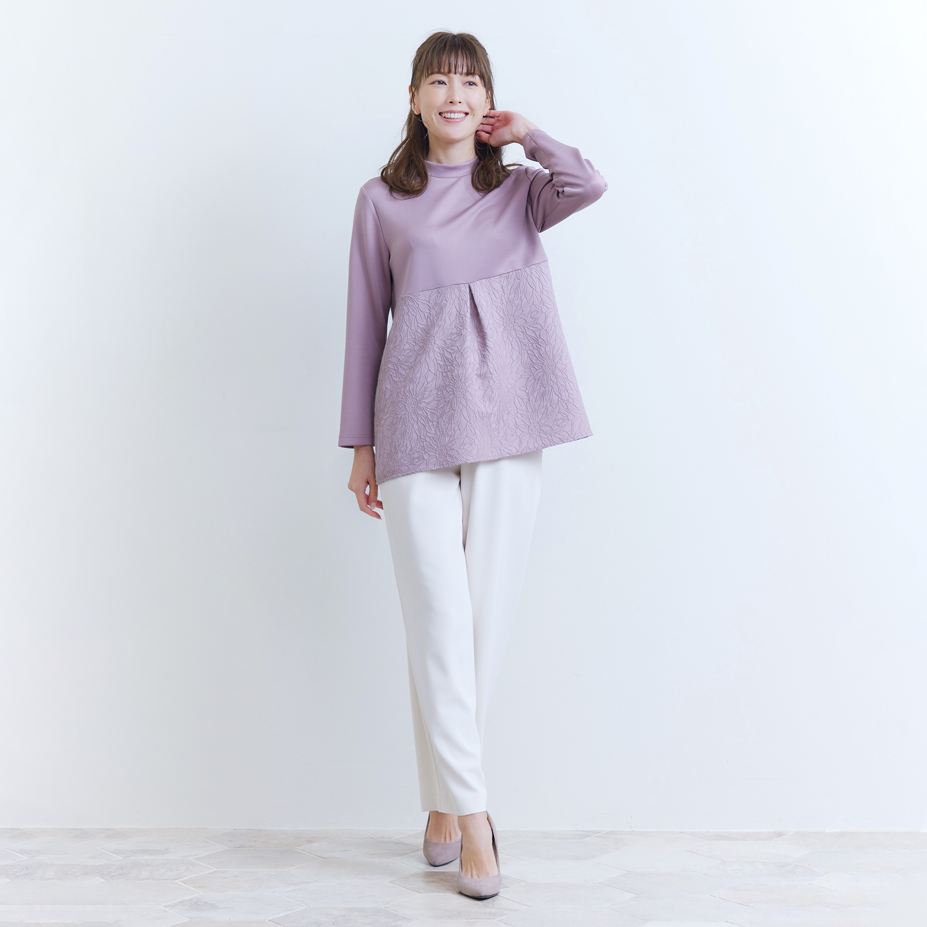 ジャガード切替カットソー ¥17,600(税込み) 優しいふくらみ感のあるダンボールニットと立体的な花柄ジャカードを切り換え、華やかなルックスに仕上げたカットソ...