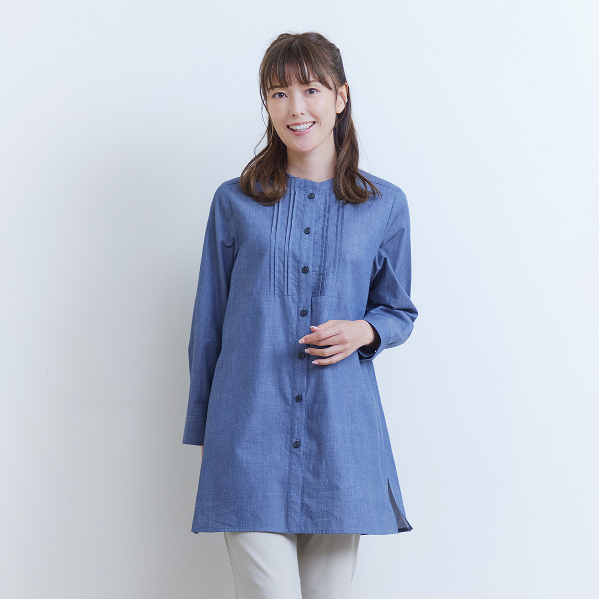 タックロングブラウス 19,800円 上品なルックスの綿シャンブレー素材を使用し、一枚でも羽織りとしても長いシーズン活躍するバンドカラーロングブラウス。 胸元の...
