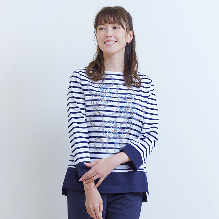ボーダーカットソー 17,600円 レースをイメージしたサークルプリントに、光沢のあるジオメトリックラメ刺繍を重ねたボーダー切り替えカットソー。 フェミニンな印...