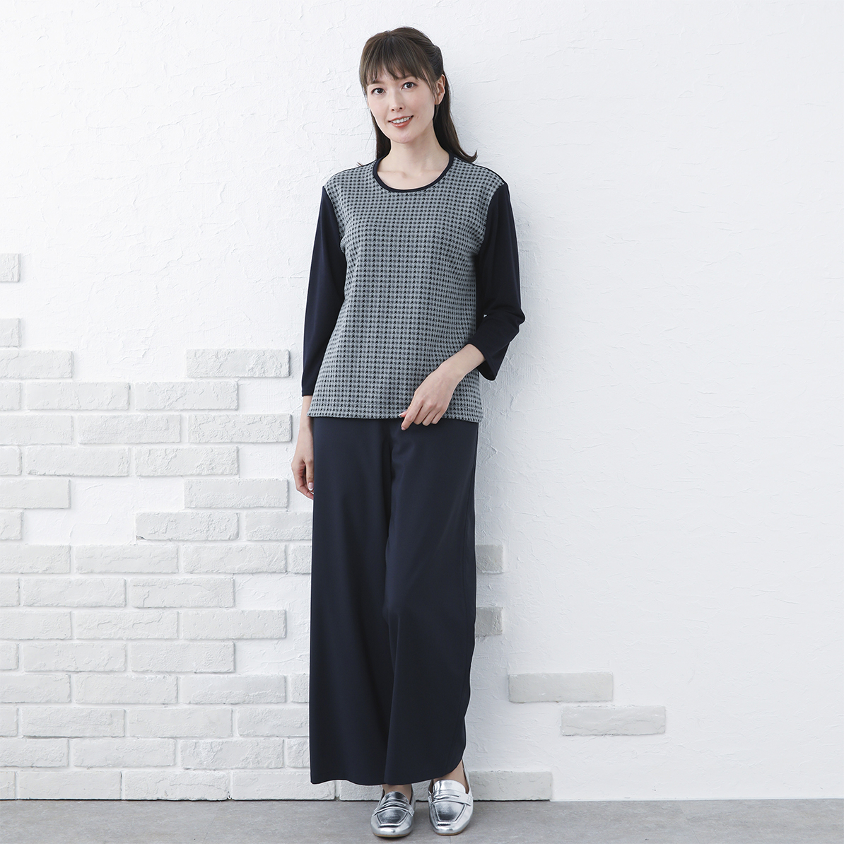 ハウンドトゥースカットソー ¥15,400(税込) クラシックなハウンドトゥース柄と無地素材をドッキングしたカットソー。 フロントのスリットをラウンドデザインに...