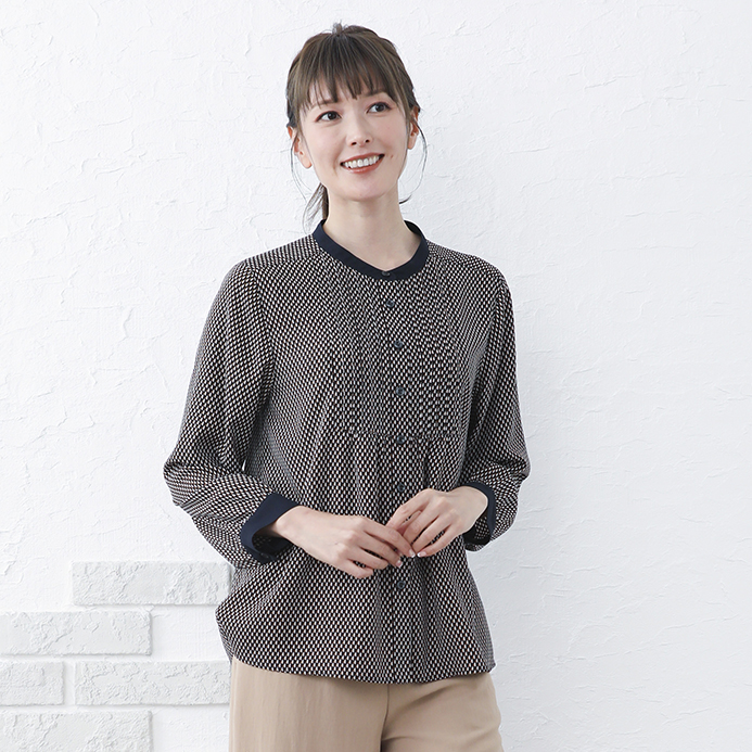 タックブラウス ¥17,600(税込) ドット幾何柄クレリックブラウス。 秋らしい深みのあるカラーが上品な印象を与えます。 胸元のタックデザインがアクセントにな...