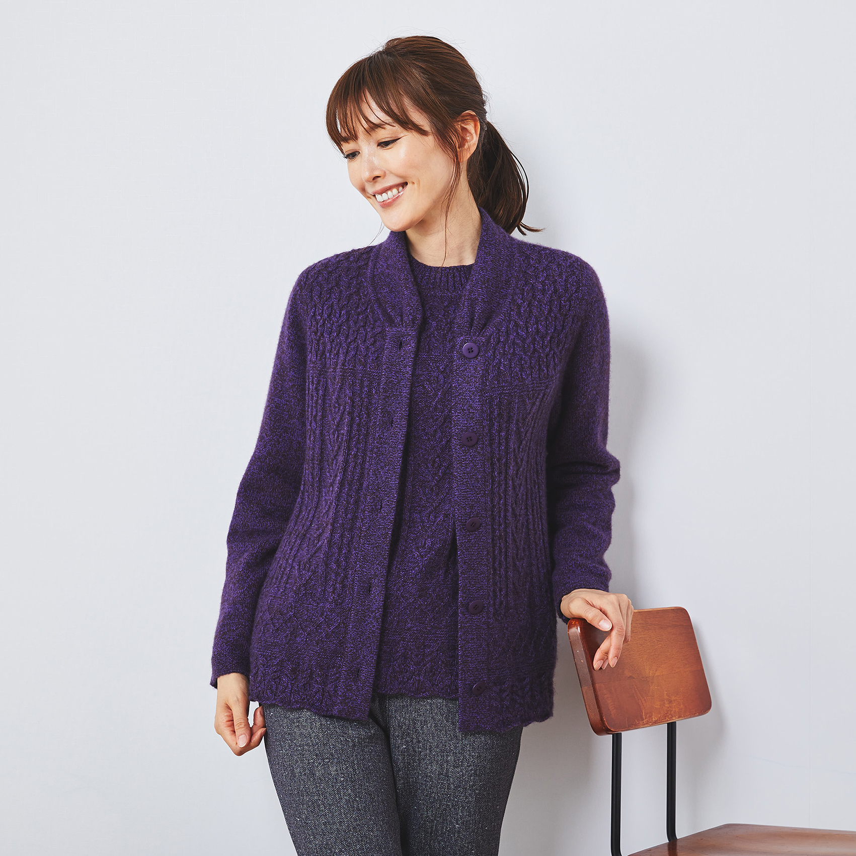 日本製にこだわったカシミヤ襟付きカーディガン&丸首ニット。 3色の糸を1本に撚ったミックスカラーが特長です。 ボリューム...