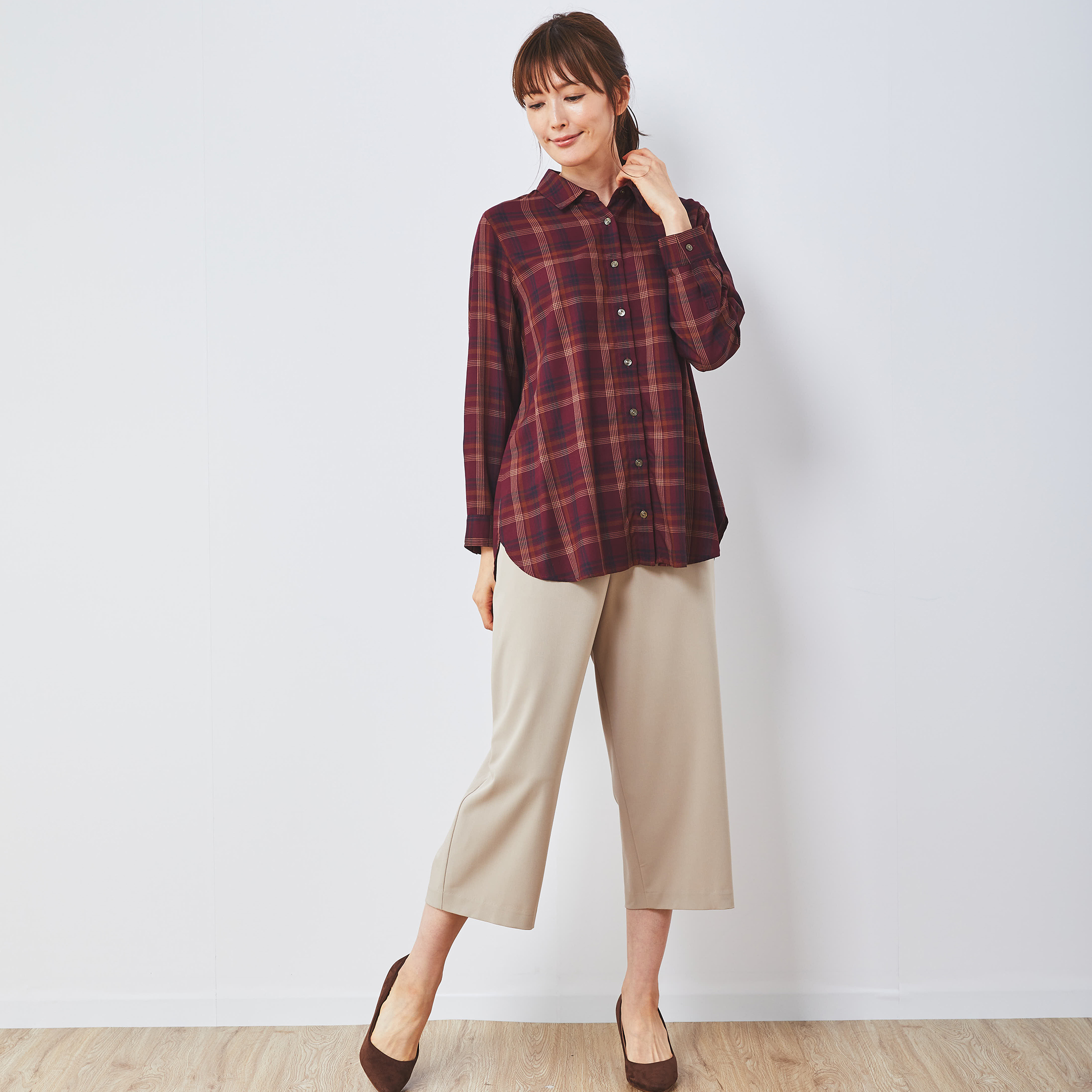 チェックブラウス ¥17,600 (税込) ワイドクロップドパンツ ¥15,400(税込) 落ち着いたカラーのチェック柄と美しいドレープを描く素材が上品なルック...