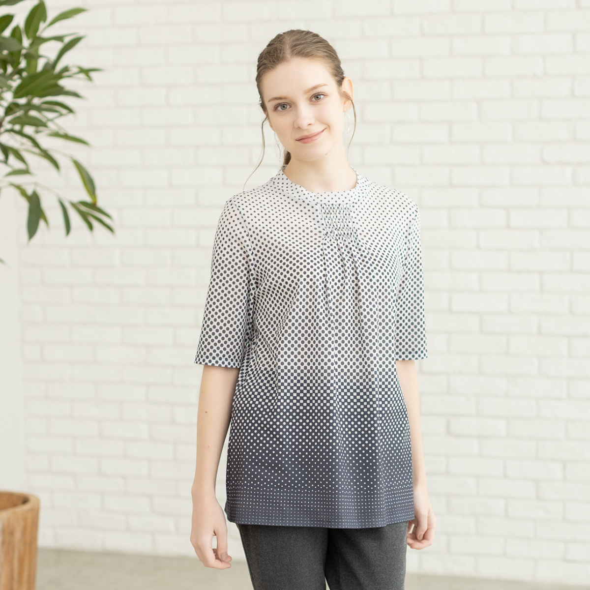 パワーネットカットソー ¥17,600 軽く、さらっとした肌触りで通気性とストレッチ性に優れた日本製パワーネットカットソー。 ドットのグラデーションプリントがモ...