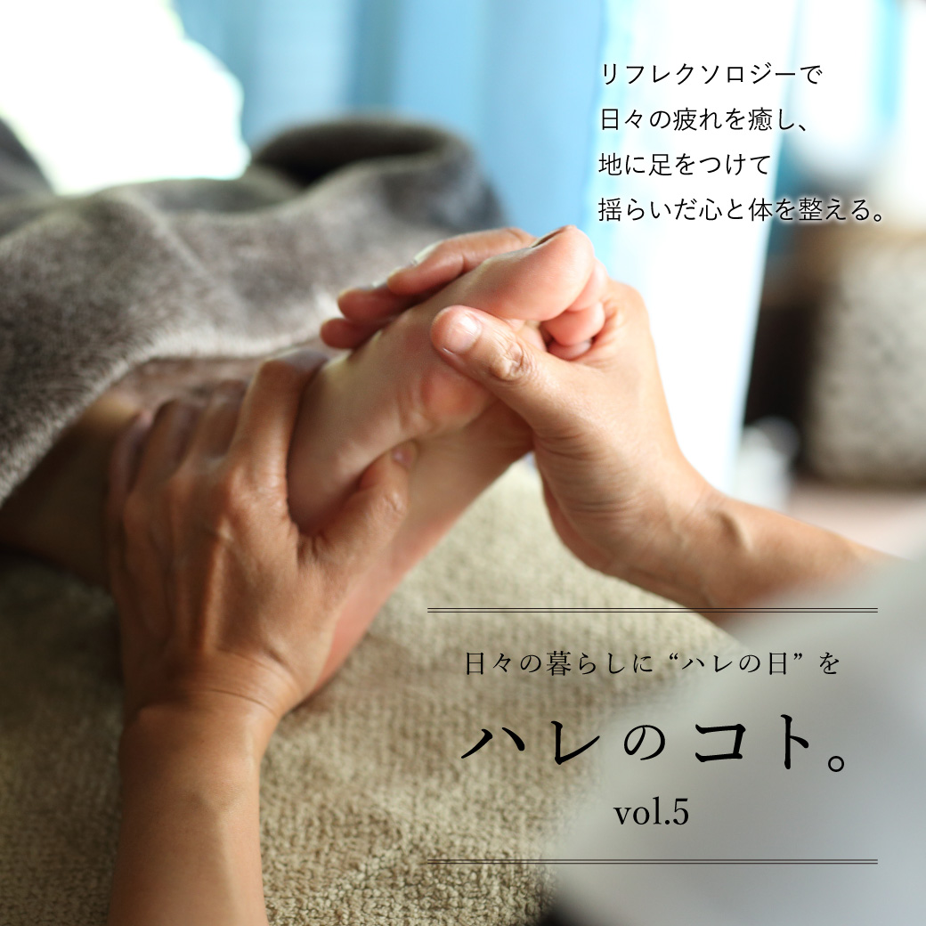 ハレのコト。vol.5日々の暮らしに"ハレの日"を ハレのコト。vol.5 リフレクソロジーで日々の疲れを癒し、 地に足をつけて揺らいだ心と体を整える。 「心までハレにするMaris...