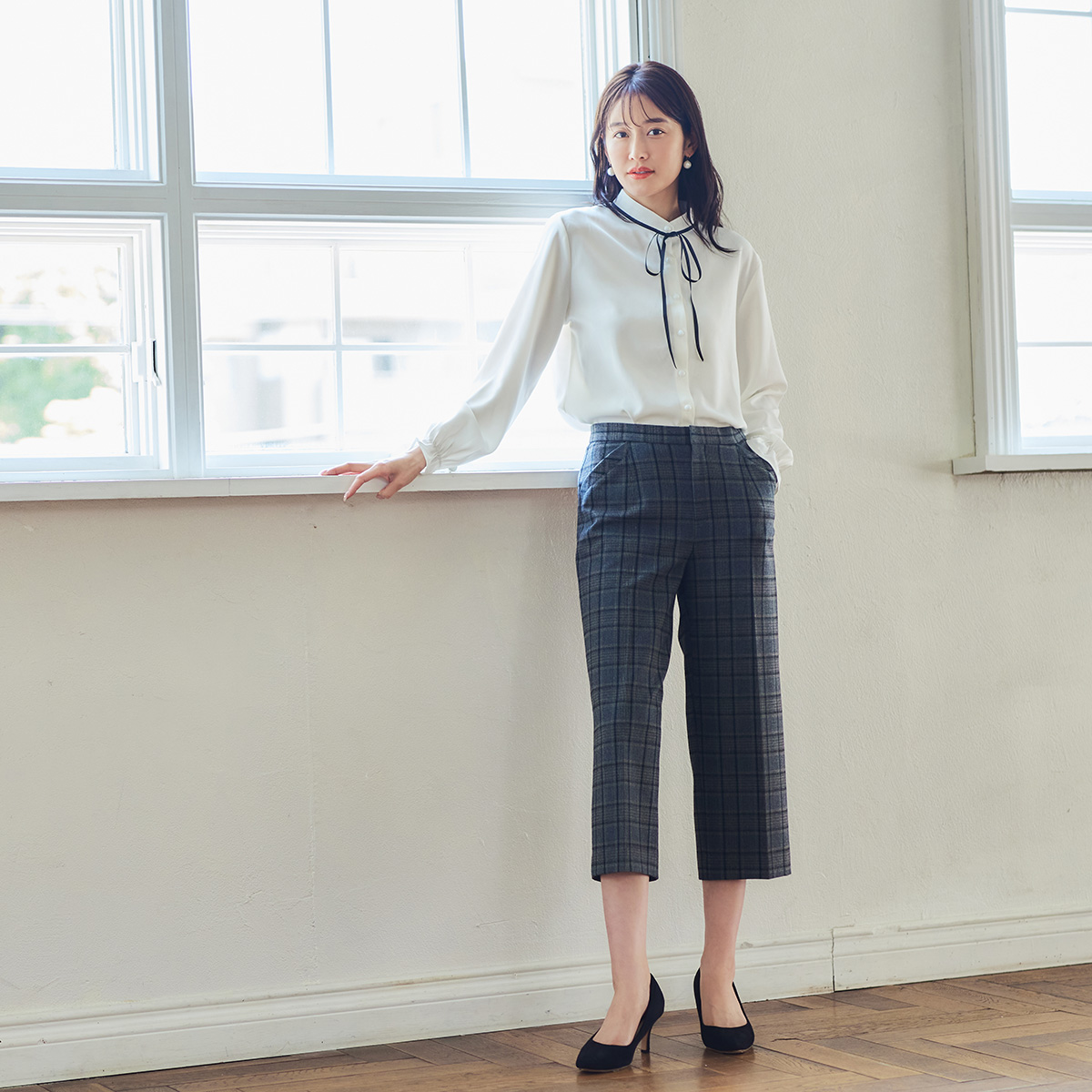 セミワイドクロップドパンツ(612JD505)¥19,800(税込)発売中 チェック柄のベージュ・グレー/無地のグレー・ブルー・ブラックの5色 2(S)~8(L...
