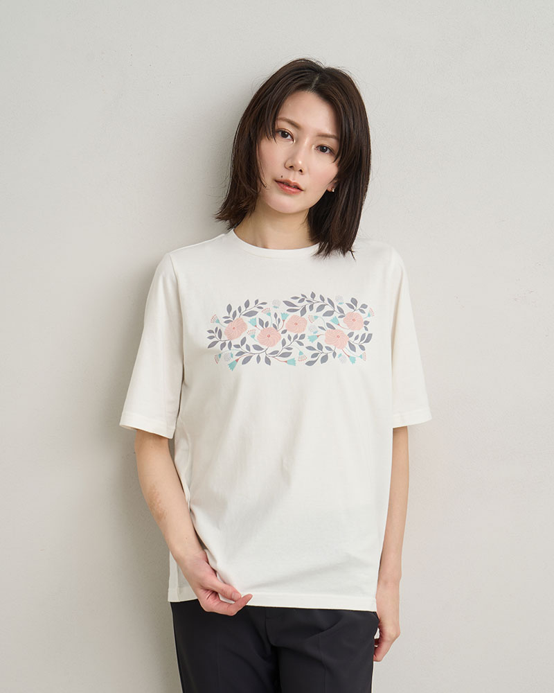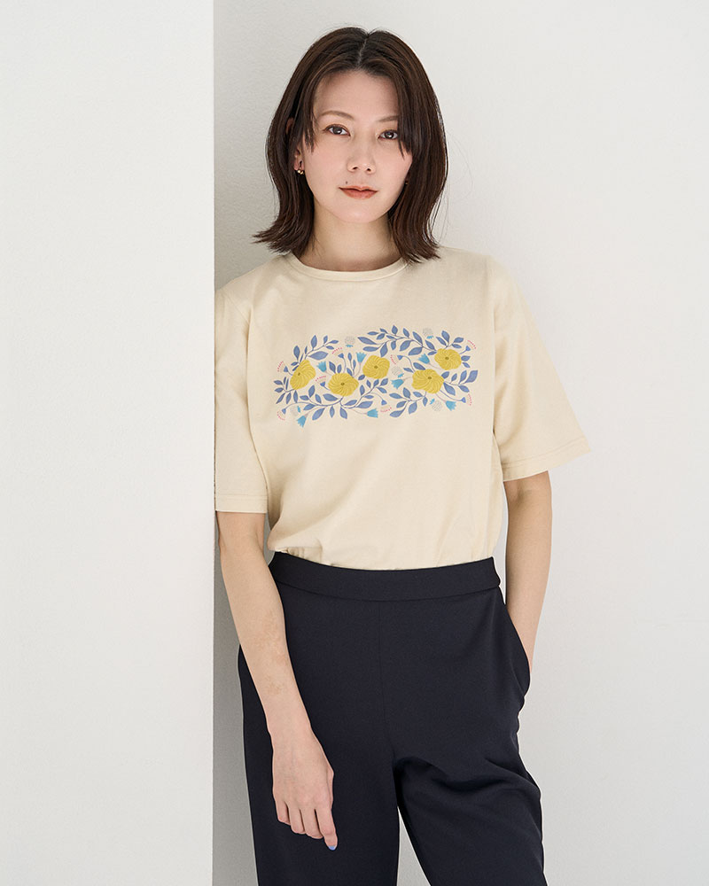 北欧の空気を感じる、やわらかなタッチで、どこか温かみのある表情に仕上がりました。花をモチーフにした一枚は、さまざまなスタイルに自然と溶け込み、長く愛用したくなる存在です。