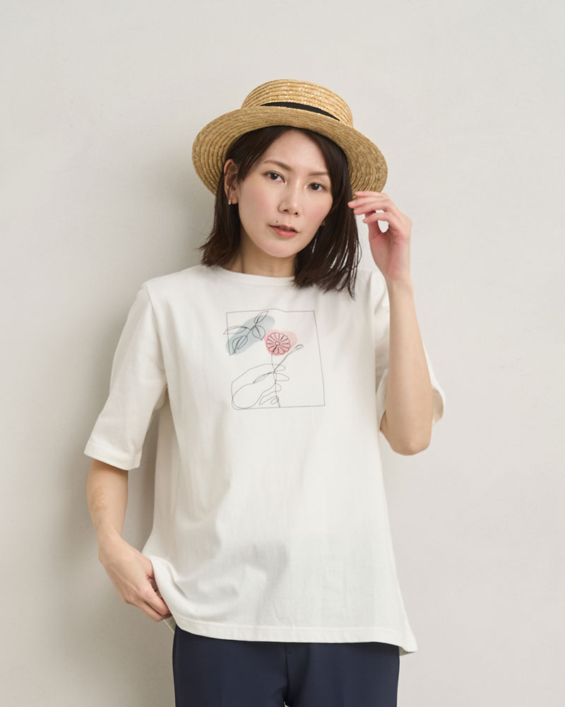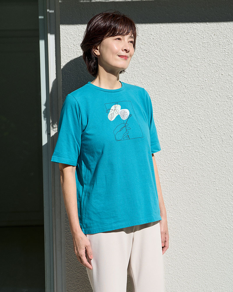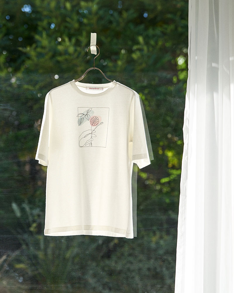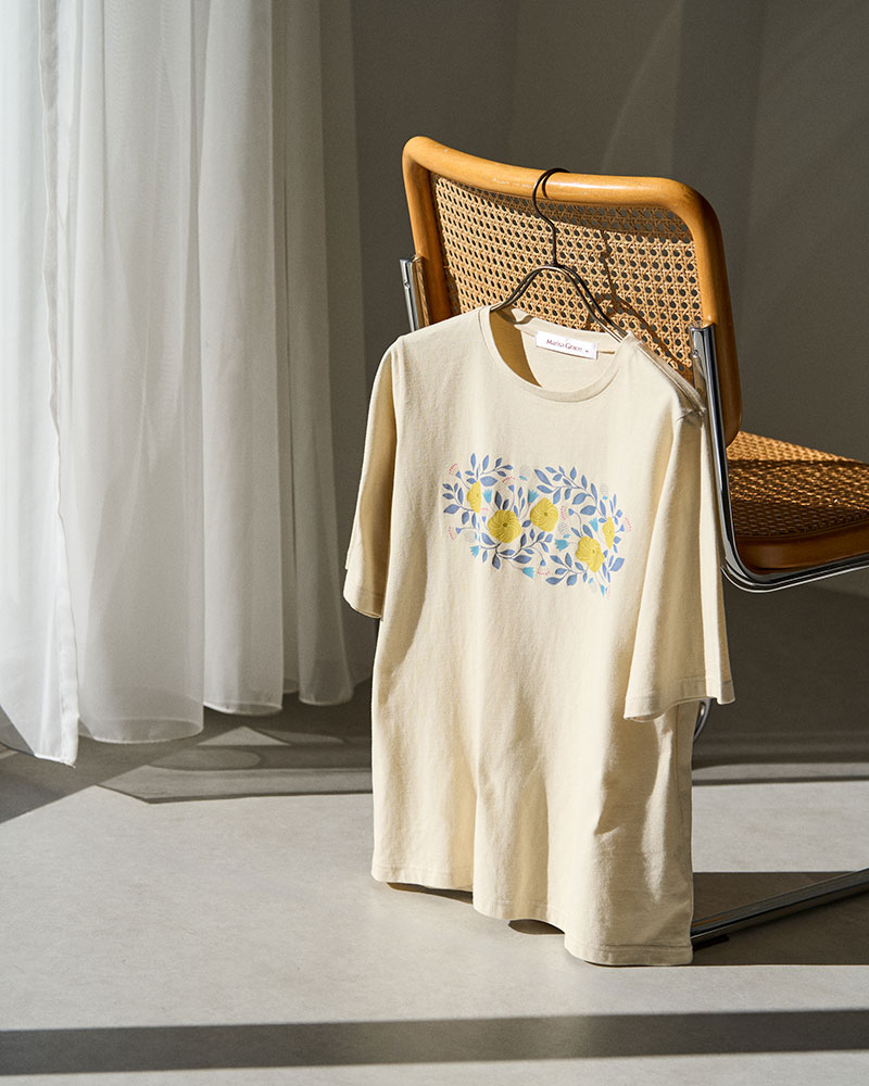 繊細な線とやわらかな色が、装いに静かな余韻を残します。風景の一部を切り取ったようなデザインは、シンプルな夏の装いに、穏やかな奥行きを添えてくれます。