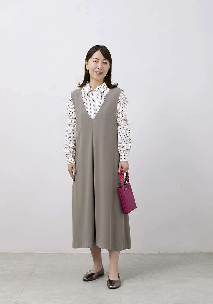 「薄くテロっとした素材が柔らかな肌質に馴染むウェーブタイプ。シャープなV ネックは苦手ですが、首まわりの詰まったブラウスをインすることで、さびしく見えがちな上半身をカバー。ソフトな素材感と小さなドット柄も好相性です。裾が広がるスカートは、重心が下がって見えやすいウェーブタイプには不向きなので、フレアスカートを合わせるなら落ち感のある素材を選ぶのがおすすめ。外ハネのヘアスタイルで動きを出し、目線を上げる工夫も。足もとは肌見せで抜け感を出し、コンパクトなバッグを合わせるとバランスよくまとまります」